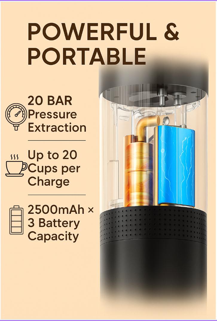 - Long-Lasting Battery – 3×2500 mAh; up to 20 cups per charge.